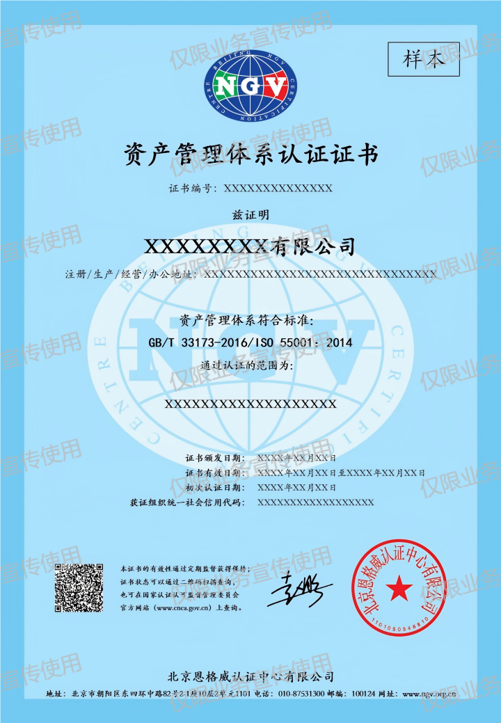 认证依据旧版标准为GB/T 33173—2016/ISO 55001:2014《资产管理 管理体系 要求》,认证依据新版标准为ISO 55001:2024《资产管理 管理体系 要求》