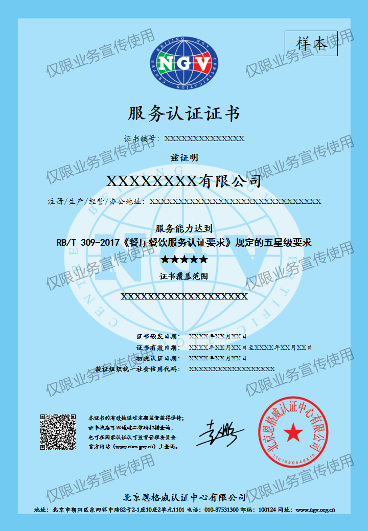 所属认证领域:SC04 住宿服务;食品和饮料服务