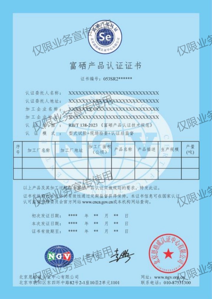富硒产品认证是北京恩格威认证中心依据我国相关法律法规,结合市场需求而推出的NGV认证业务,旨在为富硒产业的规范发展提供第三方合格评定服务,以积极回应市场需求,支持富硒产业的发展。